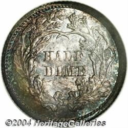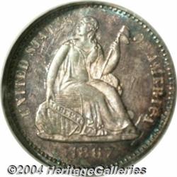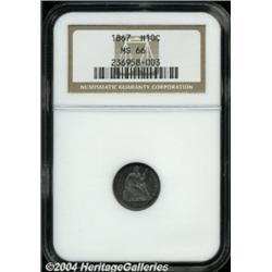 <B>1867<H10C> MS66 NGC.</B></I> Moderately toned in violet and turquoise shades, with prominent die clashing surrounding the portrait on the obverse. The AL in HALF is not fully struck, but the devices are generally crisp. The fields are somewhat prooflike, which is not a surprise given the low mintage. A mere 8,000 business strikes were issued. Population: 12 in 66, 1 finer (3/04). <BR><BR><B>Important notice:</B> Heritage usually auctions material at the rate of 200-250 lots per hour. On some occasions eBay Live bid software or the Internet may not be able to keep up with the pace of the auction. We recommend placing a realistic absentee bid now as insurance to avoid disappointment. Occasionally the auctioneer may eliminate or reject an eBay Live bid, and the auctioneer may also reopen a lot after the close of the eBay live bidding (usually because we missed an audience bid), and may reject your bid even if it shows you as the winning bidder. By bidding via eBay Live, you agree that Heritage may award the lot to another bidder at its sole discretion under the circumstances described above or any other reasonable circumstances. Since eBay bids are not shown to us until we open the lot on the floor, we treat those bids just like floor bids. In most cases the floor responds before the eBay bid is presented to us, due to Internet lag time, so for consistency we have made it a policy that floor bids are always considered first over tie eBay live bids. Also please note that all Heritage lots purchased through eBay Live carry a 20% Buyer's Premium. Please make sure you read the Terms and Conditions before you bid. </span></font></tr></table></td></tr></table>