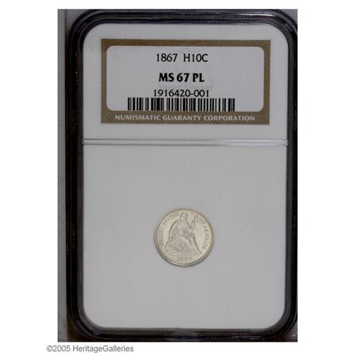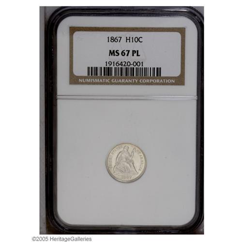 <B>1867<H10C> MS67 Prooflike NGC.</B></I> A simply gorgeous Premium Gem, both the obverse and reverse fields are noticeably Prooflike, beneath a light layer of milky toning on the reverse. The reverse is only slightly weak on the left side of the wreath. An unquestionably original representative that is the single finest graded example, at NGC, where it is the only piece graded as Prooflike, as well as being the sole recipient of the MS67 designation.