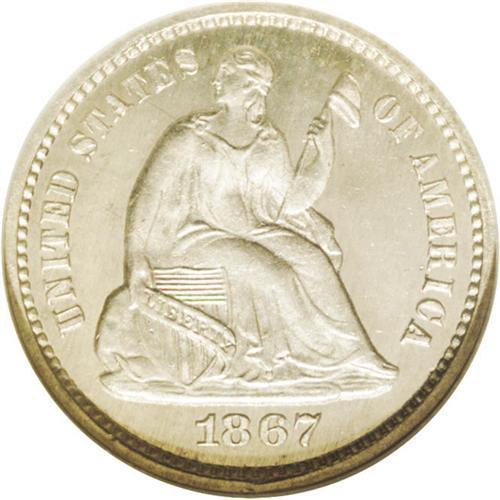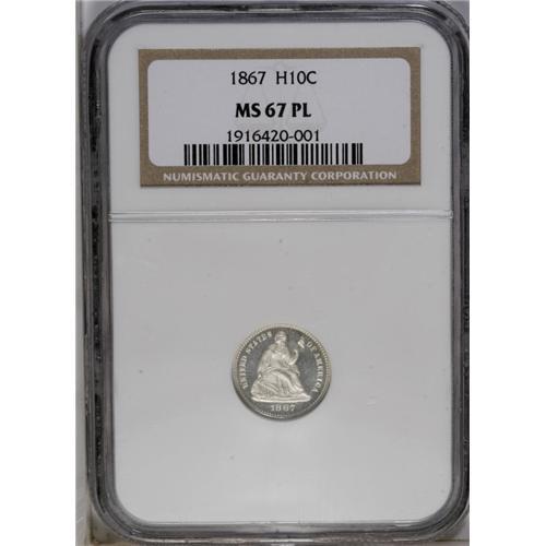 <B>1867<H10C> MS67 Prooflike NGC.</B></I> A simply gorgeous Premium Gem. Both fields are noticeably Prooflike, the devices are frosty. Brilliant save for slight milk-white toning on the reverse field. The strike is bold save for minor incompleteness on the left side of the wreath. An unquestionably original representative that is the single finest graded example at NGC, where it is the only piece graded as Prooflike, as well as being the sole recipient of the MS67 designation.