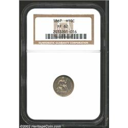 1867 H10C PR62 NGC. Glossy and shiny surfaces display some hairlines, but no other marks of note. Nicely toned in light champagne hues. Important notice: We expect to be auctioning lots at the rate of 200-250 per hour. Sometimes eBay Premier live bid software cannot keep up with that pace, so we strongly recommend that you place a realistic proxy bid now as insurance to avoid disappointment. Also please note that all Heritage/CAA lots purchased through eBay Premier carry a 20% Buyer's Premium. Please make sure you read the Terms and Conditions.