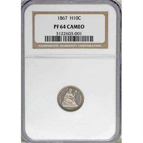 <B>1867 H10C PR64 Cameo NGC.</B></I> Delicate champagne patina drapes each side of this heavily contrasted near-Gem. Faint hairlines in the fields preclude a finer designation. Census: 7 in 64 Cameo, 17 finer (12/07).<BR><I>Ex: Stack's Coin Galleries Mail Bid Sale, July 18, 1990, lot 2824.<BR>From The John Stimson, Sr. Collection, Part One.</B></I><BR><BR><b>Shipping:</b> Coins & Currency (<a target="_blank" href="http://www.heritageauctions.com/common/shipping.php">view shipping information</a>)