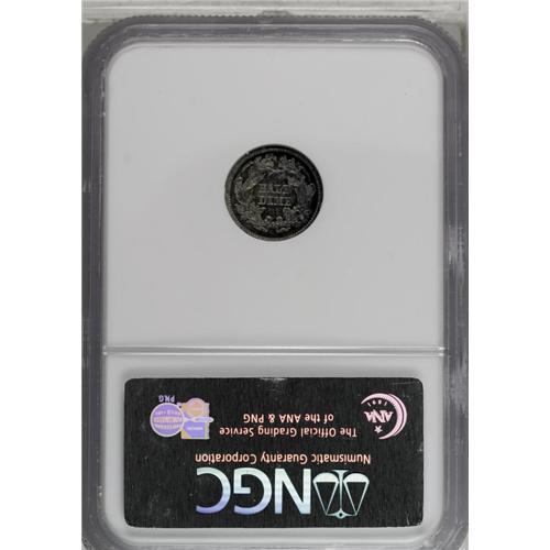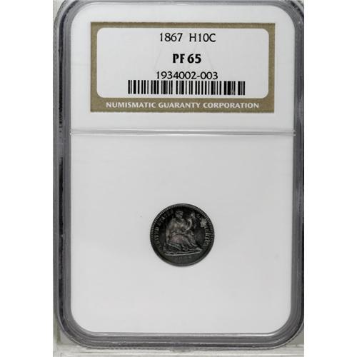 <B>1867<H10C> PR65 NGC.</B></I> Deep violet-purple toning with salmon traces and nearly flawless definition. One of the smallest total deliveries of any half dime issue and normally available in Choice and finer conditions only as a proof.