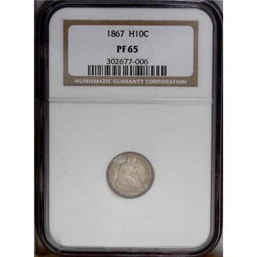<B>1867<H10C> PR65 NGC.</B></I> Speckled rose-gray patina over both sides is augmented by iridescent sea-green toning near the peripheries. Sharply struck and free of noticeable contact marks or hairlines. Only 8,000 business strikes and 625 proofs were produced in 1867, the lowest total mintage output in the entire Seated Liberty series. Census: 36 in 65, 39 finer (1/06).