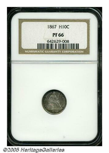 <B>1867<H10C> PR66 NGC.</B></I> The sharply struck design elements exhibit a relatively strong contrast against the reflective fields. The obverse central device is mostly deep beige, while the obverse fields are a mixture of iridescent cobalt-blue, golden-brown, faded crimson, and lavender. The reverse portrays an even distribution of iridescent cobalt-blue patina. The surfaces are impeccably preserved. Population: 30 in 66, 6 finer (4/05).