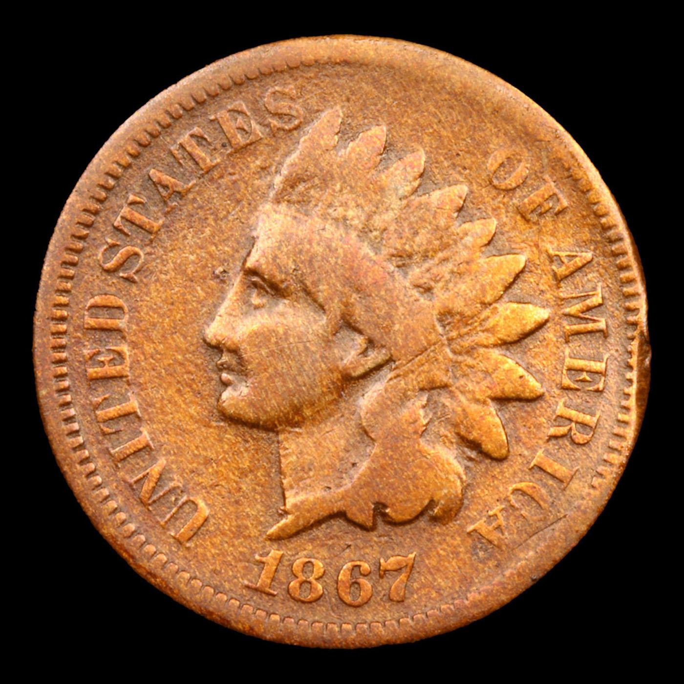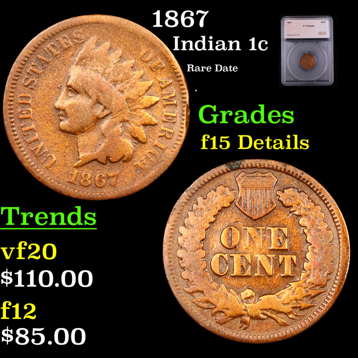1867 Indian Cent 1c Graded f15 BY SEGS. PCGS estimates only 5000 survive in all grades. A very tough date.