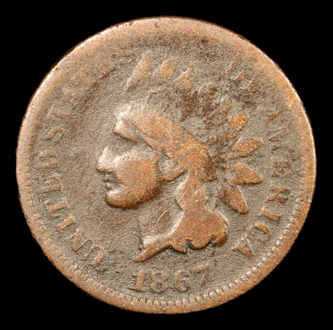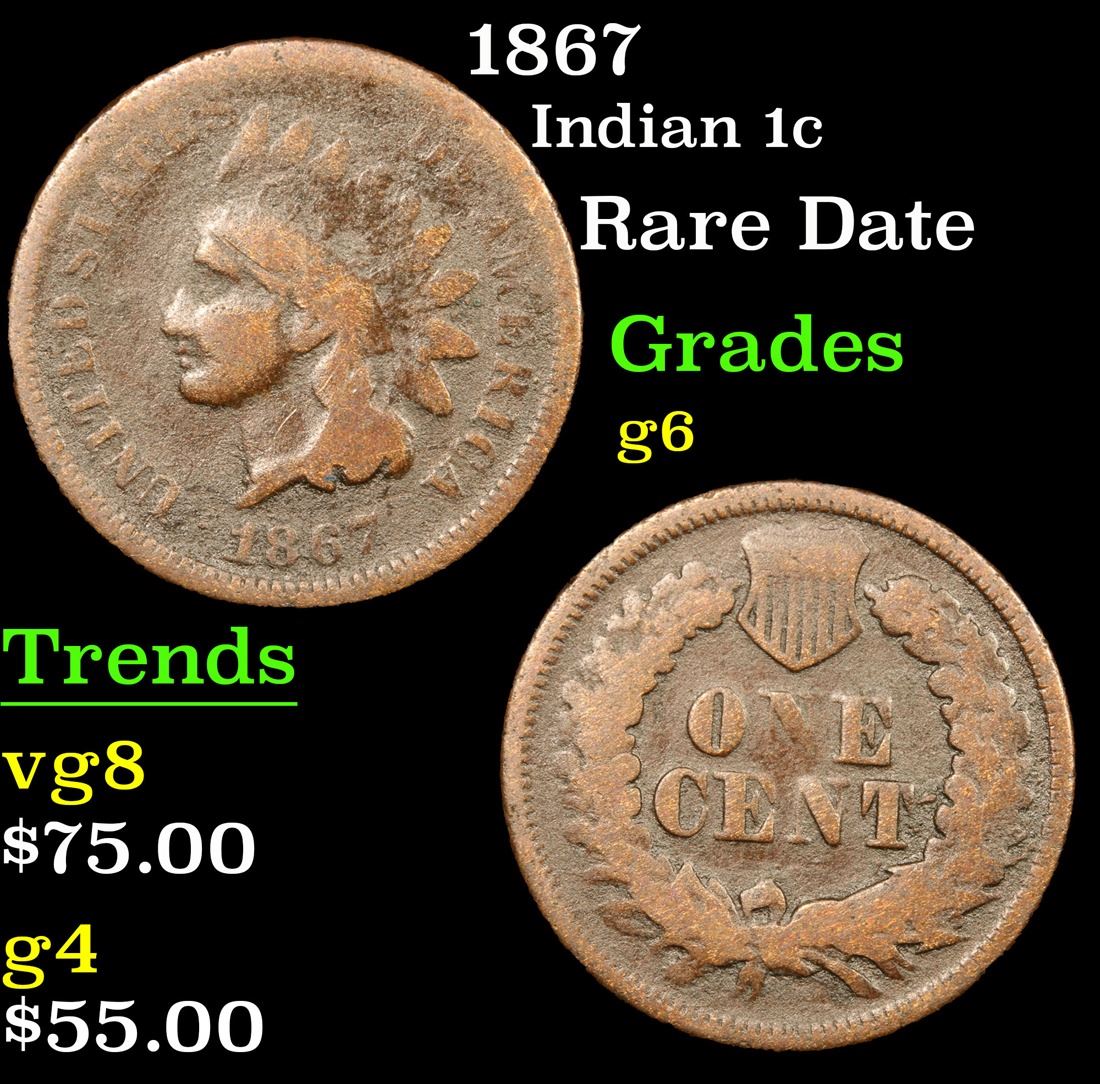 1867 Rare Date . Indian Cent 1c Grades g+. PCGS estimates only 5000 survive in all grades. A very tough date.