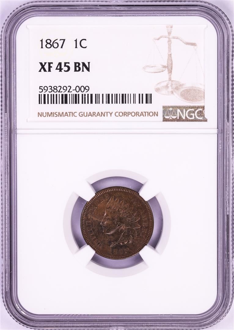 One 1867 Indian Head Cent Coin NGC XF45BN. NGC Certified.