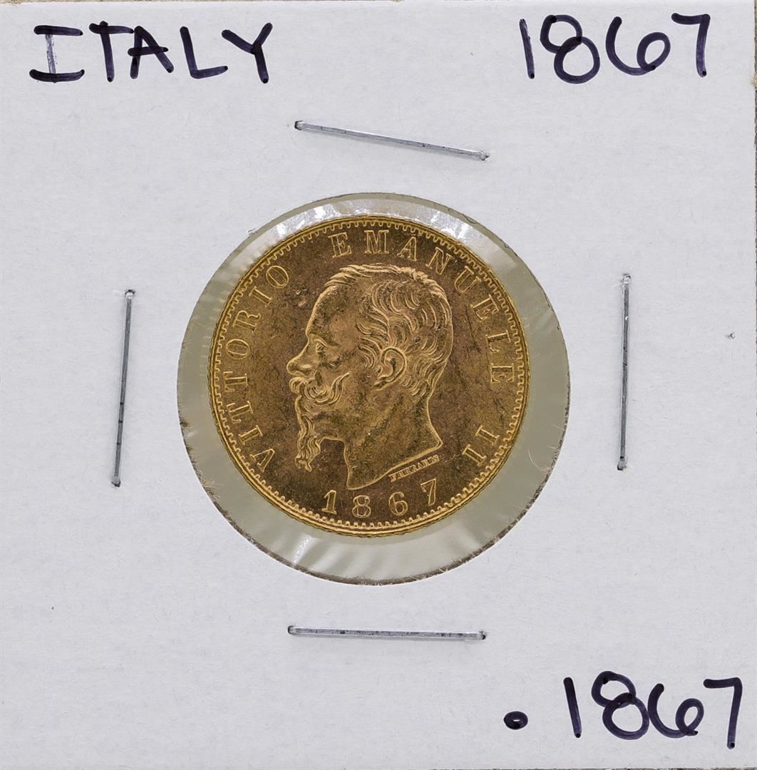 One 1867 Italy 20 Lire Umberto Gold Coin.