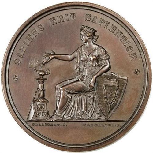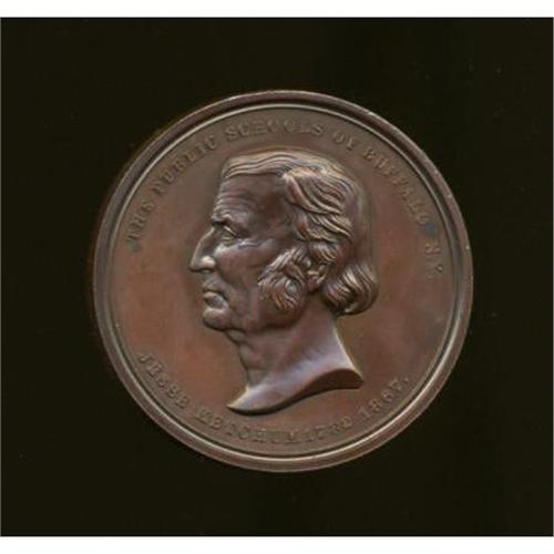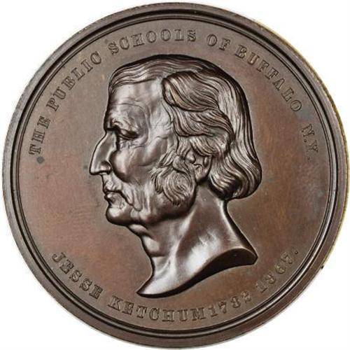 <B>1867 Jesse Ketchum Medal.</B></I> Julian SC-15. Bronze, 48.5 mm, 70.6 gm. Engraved by William & Charles Barber and designed by the lesser-known Sellstadt. Obverse: bust left. Reverse: allegorical female contributes fuel to lamp of learning. Ketchum (1782-1867) was a financial contributor to the Buffalo, New York public schools.<BR><BR><b>Shipping:</b> Coins & Currency (<a target="_blank" href="http://www.heritageauctions.com/common/shipping.php">view shipping information</a>)