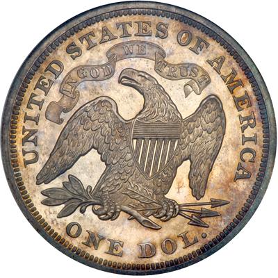 1867 Liberty Seated Dollar. NGC graded Proof 65 Cameo. A well struck Gem with warm natural toning on both sides. Only 625 Proofs struck. This coin is on easy friendship with its smooth mirror finish and overlay of original colors. The whole fabric of it being well balanced and attractive. As we see it, when it comes to the centers of the main motifs, the strike is above-average, sharp, and well defined in all areas. This exceptional 1867 Proof Seated Liberty dollar is the perfect specimen for a collection of distinction, and a coin with a Cameo designation and far nicer than most, definitely on a par with some in putatively higher grades. Opportunities to acquire any Proof 1867 dollar in gem condition are limited. The chance to acquire the present first-rate Proof 65 must be seriously considered. Pop 10; 13 finer.