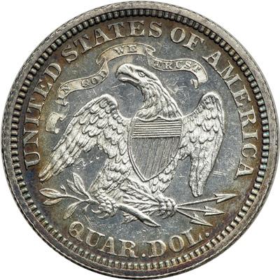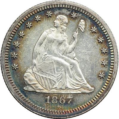 1867 Liberty Seated Quarter Dollar. PCGS graded Proof 58. We believe this is a Mint State coin as it exhibits die striations consistant with a business strike as well as mint frost and luster of a business strike. Only 20,000 struck for general usage. Rarely offered for sale.