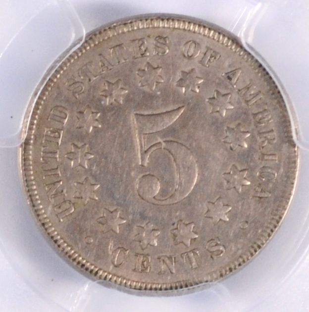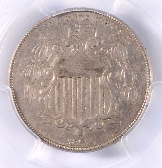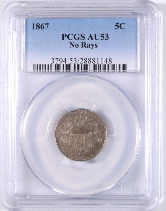 1867 NO RAYS SHIELD NICKEL, PCGS AU-53 NICE COIN!