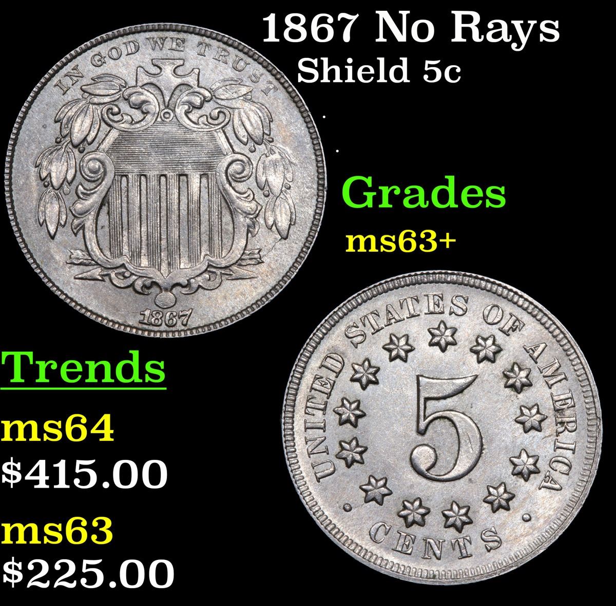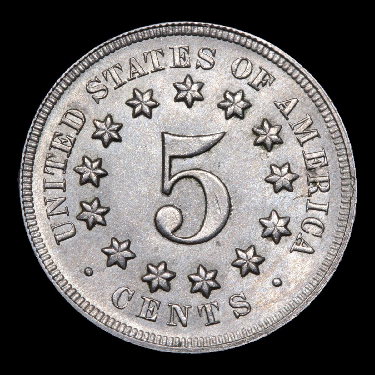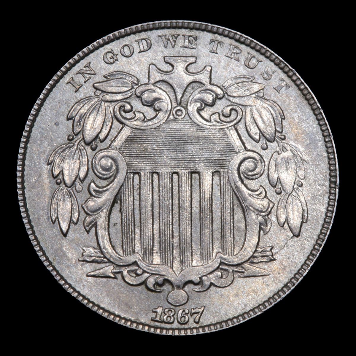 1867 No Rays . . Shield Nickel 5c Grades Select+ Unc.
