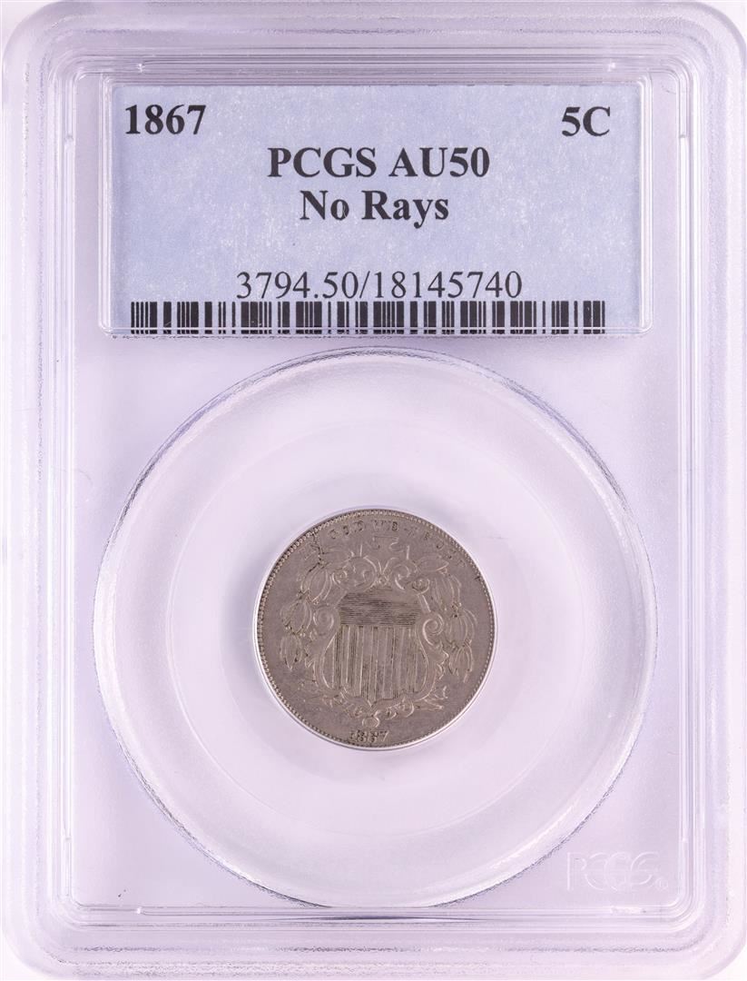 One 1867 No Rays Shield Nickel Coin PCGS AU50. PCGS Graded.