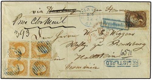 1867 (Nov. 12) SAVANNAH, GA. to HOLSTEIN, (Germany), blue cds with matching open grids tying two 30 c. orange (71) vertical pairs and 5 c. brown (76) single on registered folded cover, blue REGISTERED in oval handstamp, red NEW YORK REGISTERED NOV. 19, 1867 rimless transit, red crayon "28" credit (7 times 4c), blue transit backstamp and manuscript "19" Sbgr (45 c) due; vertical file fold, 5 c. with some slight perf toning. Very fine usage; four-times the 30 c. Prussian closed mail rate plus 5 c. registry fee. Ex. col. Paliafito.
