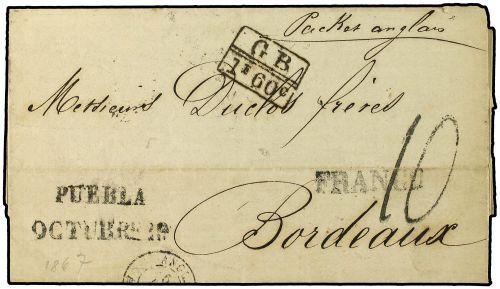 1867 PUEBLA a FRANCIA. Marca PUEBLA y FRANCO indicando que el porte local estaba pagado. Circulada por el correo británico, tasada a la llegada con "10" décimas.