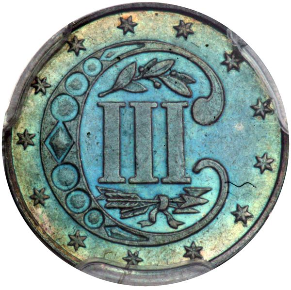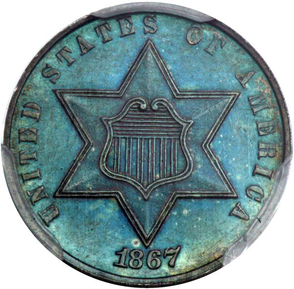1867 Pattern Three Cents. Copper, plain edge. PCGS graded Proof 62 Brown PQ. Beautiful blue toning. This uses the regular Proof dies of 1867 but is struck on a copper planchet whose surface over the intervening years has toned a striking blue color! Rarely offered. Pop 1; 1 finer in 64BN (PCGS # 60770) .