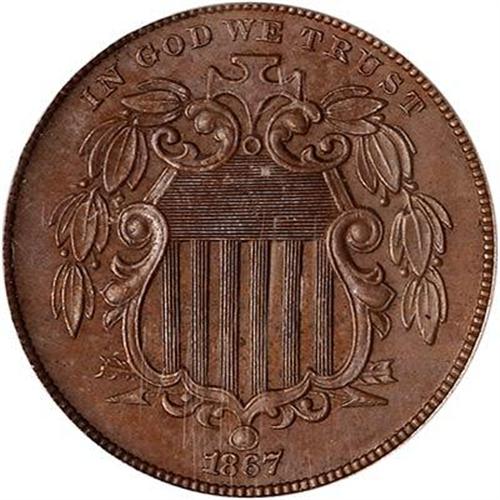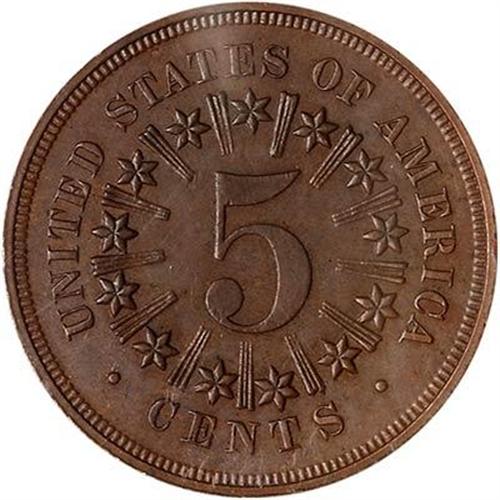 This is an important and prized trial strike of the regular die piece of the first or "With Rays" type of shield nickel, with stars and rays encircling the large 5 of the denomination, CENTS below along the rim. Struck in copper and described as Rarity-6 by Judd, or 13 to 31 pieces believed to have been struck. (Judd's rarity rating, which everyone uses today on regular coinage as well as Patterns, referred to the number of pieces made and not the number known or in collector's hands which, in most instances, is far fewer in the case of the Patterns.)