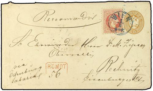 1867 Registered postal stationary envelope of the Arms type 1863 issue 15 Kr brown upgraded with Franz Joseph 5 Kr red (Yvert 34) tied by WIEN cds in blue with adjacent handstruck boxed RCMDT. in red with GUNS transit and RECHWITZ arrival on reverse. Superb quality item of mixed issue Austria.
