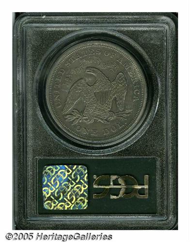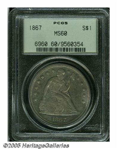<B>1867<S$1> MS60 PCGS.</B></I> Breen-5478, 1867 Over Smaller Date. A seldom-seen issue that is elusive in all grades. Originally toned in turquoise-green and lavender-gray, the surfaces are most notably marred by a group of small blemishes in the right obverse field area. Population: 5 in 60, 35 finer (6/05).<BR><I>From The Dr. John L. Pellegrini Collection of Liberty Seated Dollars.</B></I>