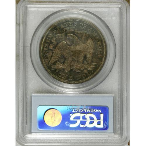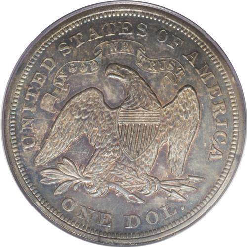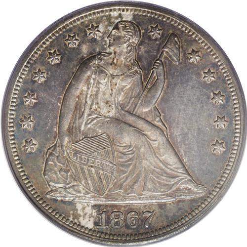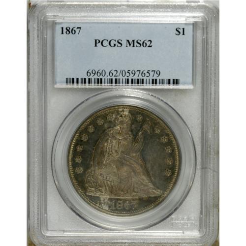 1867 S$1 MS62 PCGS. The surfaces are deep cobalt-blue,