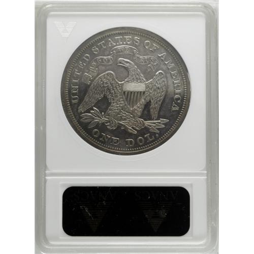 <B>1867<img border='0' src='http://www.heritagecoins.com/images/star.gif' width=10 height=10>$1> PR62 ANACS.</B></I> The strike is bold on this proof Seated dollar. The surfaces are mostly dove-gray with mottled violet and lilac on the reverse. Light hairlines define the grade.