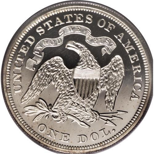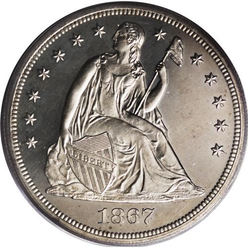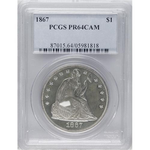 <B>1867 S$1 PR64 Cameo PCGS.</B></I> The obverse shows a light golden cast, with moderate field-device contrast, while the reverse appears fully brilliant silver-white, with deep black-on-white contrast. A few light hairlines show in the obverse field only under a high-powered loupe, but this well-struck coin offers huge amounts of eye appeal. Population: 13 in 64 Cameo, 3 finer (1/07).<BR><BR><b>Shipping:</b> Coins & Currency (<a target="_blank" href="http://www.heritageauctions.com/common/shipping.php">view shipping information</a>)