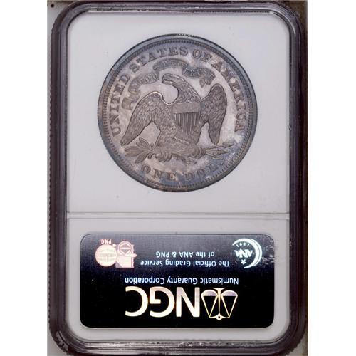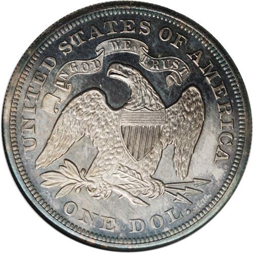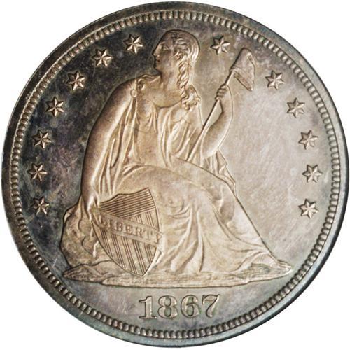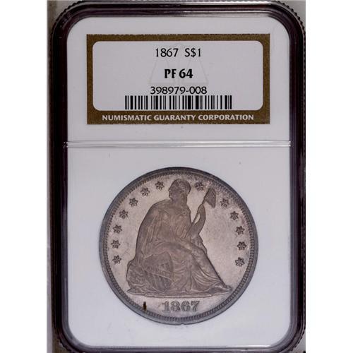 <B>1867<img border='0' src='http://www.heritagecoins.com/images/star.gif' width=10 height=10>$1> PR64 NGC.</B></I> The 1867 proof dollar, with a mintage of 625 pieces, is relatively unavailable in the better grades. About 130 near-Gem proofs have been certified, and approximately 30 specimens finer. This piece displays cameo tendencies when the coin is tilted beneath a light source. The design features are exquisitely struck, and the surfaces exhibit a thin coating of russet coloration accented with touches of cobalt-blue. There are no mentionable abrasions to report. A few inoffensive, wispy hairlines are noted, as are a couple of unobtrusive, toned-over linear marks on the upper part of Liberty's right leg. Census: 66 in 64, 15 finer (2/06).