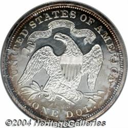 <table><tr><td><table><tr><td>1867 S$1 PR64 S Cameo NGC. Golden-brown and electric-blue patina frames the brilliant centers of this impressive near-Gem. The strike is needle-sharp, and the contrast between the lightly toned devices and the mirrored fields is substantial. Only 625 proofs were struck, and far fewer survive than are needed to satisfy the demand from specialists of this challenging series. One of just two 1867 Seated Dollars that have been assigned a star designation (for superior eye appeal) by NGC. <BR><BR><B>Important notice:</B> Heritage usually auctions material at the rate of 200-250 lots per hour. On some occasions eBay Live bid software or the Internet may not be able to keep up with the pace of the auction. We recommend placing a realistic absentee bid now as insurance to avoid disappointment. Occasionally the auctioneer may eliminate or reject an eBay Live bid, and the auctioneer may also reopen a lot after the close of the eBay live bidding (usually because we missed an audience bid), and may reject your bid even if it shows you as the winning bidder. By bidding via eBay Live, you agree that Heritage may award the lot to another bidder at its sole discretion under the circumstances described above or any other reasonable circumstances. Since eBay bids are not shown to us until we open the lot on the floor, we treat those bids just like floor bids. In most cases the floor responds before the eBay bid is presented to us, due to Internet lag time, so for consistency we have made it a policy that floor bids are always considered first over tie eBay live bids. Also please note that all Heritage lots purchased through eBay Live carry a 20% Buyer's Premium. Please make sure you read the Terms and Conditions before you bid. <BR><BR><B>IMPORTANT ANNOUNCEMENT ABOUT RESERVES:</B> Heritage now divulges all reserves on its web site 7 days before every auction. If you want to know whether the reserve on this lot has been met, and if not, what the reserve amount is, please visit this lot page on the HeritageCoin.com web site, or email: bid@HeritageGalleries.com </span></font></td></tr></table></td></tr></table>
