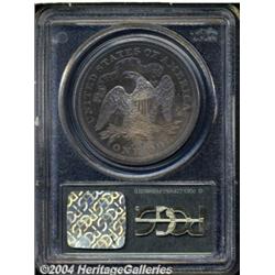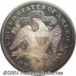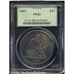 <B>1867<S$1> PR65 PCGS.</B></I> This Liberty Seated dollar is beautifully toned in variegated cobalt-blue, crimson, burnt-orange, and rose colors. The design features are exquisitely struck. No mentionable marks can be discerned over the nearly pristine surfaces. Population: 16 in 65, 0 finer (7/04). <BR><BR><B>Important notice:</B> Heritage usually auctions material at the rate of 200-250 lots per hour. On some occasions eBay Live bid software or the Internet may not be able to keep up with the pace of the auction. We recommend placing a realistic absentee bid now as insurance to avoid disappointment. Occasionally the auctioneer may eliminate or reject an eBay Live bid, and the auctioneer may also reopen a lot after the close of the eBay live bidding (usually because we missed an audience bid), and may reject your bid even if it shows you as the winning bidder. By bidding via eBay Live, you agree that Heritage may award the lot to another bidder at its sole discretion under the circumstances described above or any other reasonable circumstances. Since eBay bids are not shown to us until we open the lot on the floor, we treat those bids just like floor bids. In most cases the floor responds before the eBay bid is presented to us, due to Internet lag time, so for consistency we have made it a policy that floor bids are always considered first over tie eBay live bids. Also please note that all Heritage lots purchased through eBay Live carry a 20% Buyer's Premium. Please make sure you read the Terms and Conditions before you bid. </span></font></tr></table></td></tr></table>