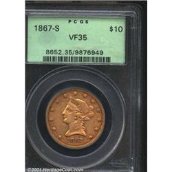 1867-S $10 VF35 PCGS.<p>The '67-S is a scarce S-mint Ten with a mintage of only 9,000 pieces. It is a condition rarity also with this piece being fifteen points finer than the average grade encountered. Evenly worn over each side, the surfaces are original and show significant portions of reddish patina, especially surrounding the devices. The only abrasion of note is a short mark below Liberty's chin. Important notice: We expect to be auctioning lots at the rate of 200-250 per hour. Sometimes eBay Premier live bid software cannot keep up with that pace, so we strongly recommend that you place a realistic proxy bid now as insurance to avoid disappointment. Also please note that all Heritage/CAA lots purchased through eBay Premier carry a 20% Buyer's Premium.
