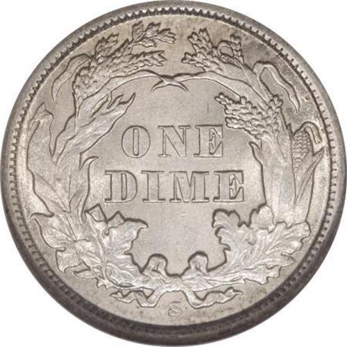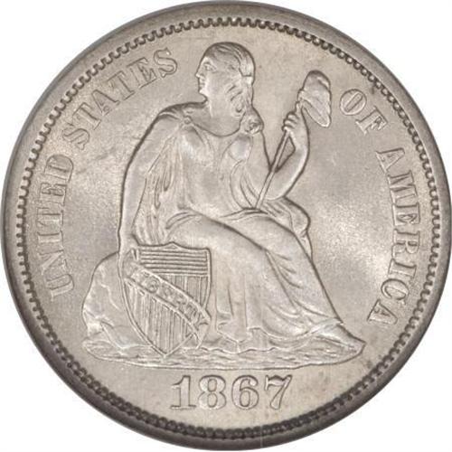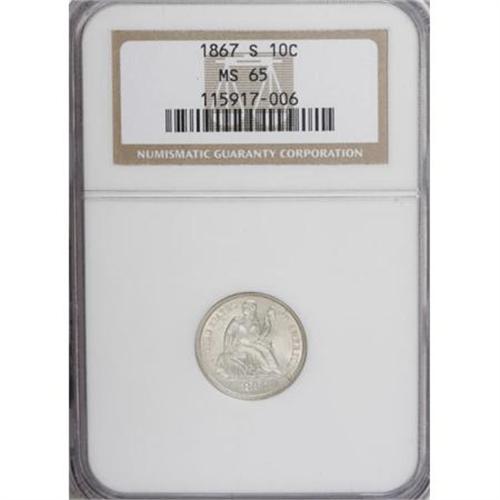 <B>1867-S 10C MS65 NGC.</B></I> Light almond-gold toning visits this lustrous and sharply struck Gem. A minor lamination is noted beneath the A in STATES. The 1867-S is even scarcer than implied by its mintage of 140,000 pieces. Between NGC and PCGS, only 18 Mint State examples are certified, and Gems are highly desirable. Census: 5 in 65, 1 finer (6/07).<BR><I>From The Belle Glade Collection, Part Two.</B></I><BR><BR><B>Coin Engraver:</B> Christian Gobrecht<BR><BR><b>Shipping:</b> Coins & Currency (<a target="_blank" href="http://www.heritageauctions.com/common/shipping.php">view shipping information</a>\)