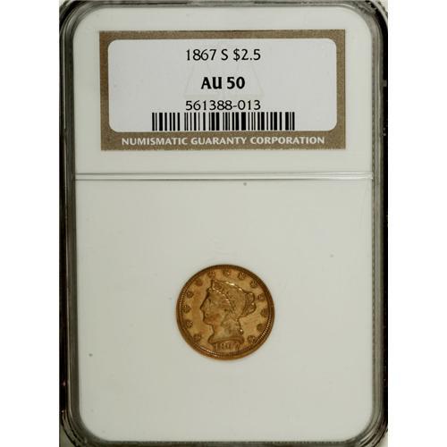 1867-S $2 1/2 AU50 NGC. A scarce issue in all grades.