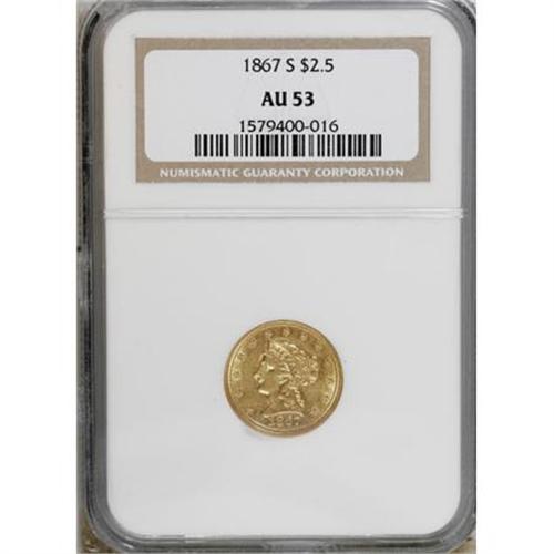 <B>1867-S $2 1/2 AU53 NGC.</B></I> The straw-gold fields retain ample luster despite minor wear on the well struck portrait and eagle. Lightly marked overall, yet exceptionally appealing for this low-mintage San Francisco issue. Census: 10 in 53, 56 finer (12/07).<BR><BR><B>Coin Engraver:</B> Christian Gobrecht<BR><BR><b>Shipping:</b> Coins & Currency (<a target="_blank" href="http://www.heritageauctions.com/common/shipping.php">view shipping information</a>)