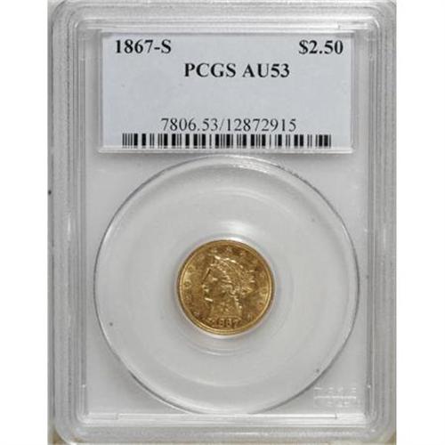 <B>1867-S $2 1/2 AU53 PCGS.</B></I> Pleasingly detailed for this challenging issue with light, even wear across the devices. Pale yellow-gold fields show scattered marks and surprisingly strong luster. Population: 2 in 53, 23 finer (3/08).<BR><BR><B>Coin Engraver:</B> Christian Gobrecht<BR><BR><b>Shipping:</b> Coins & Currency (<a target="_blank" href="http://www.heritageauctions.com/common/shipping.php">view shipping information</a>)