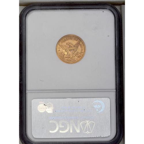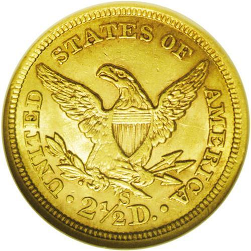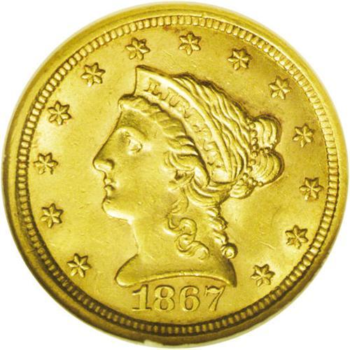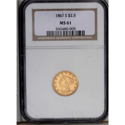 <B>1867-S<$2 1/2> MS61 NGC.</B></I> Bright luster dominates the devices and legends. The strike is bold aside from minor softness on LIBERTY and the eagle's leg. A few thin marks reside near the cheekbone, but the surfaces are generally clean for an MS61 gold coin. Moderate clash marks outline the devices. Only 28,000 pieces were struck. Census: 7 in 61, 2 finer (7/06).