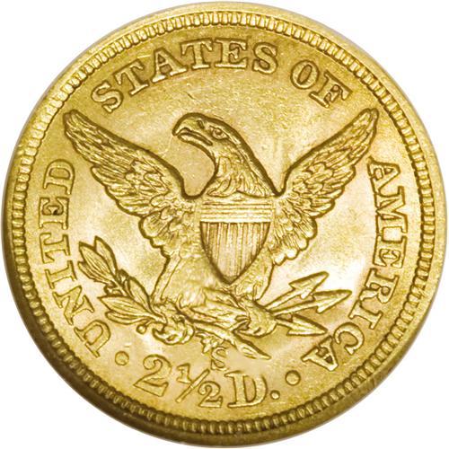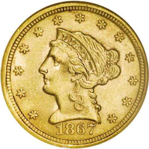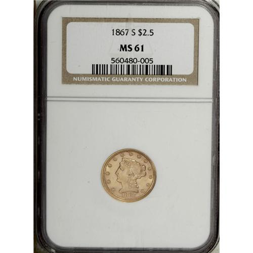 <B>1867-S $2 1/2 MS61 NGC.</B></I> Bright luster dominates the devices and legends. The striking details are sharp in all areas except on LIBERTY and the eagle's left leg, as seen on almost all S-mint quarter eagles from this era. A few wispy marks reside on the cheekbone and upper lip, but the surfaces are generally clean for an MS61 gold coin. Moderate clash marks outline the devices. Only 28,000 pieces were struck.<BR><BR><b>Shipping:</b> Coin/Currency (<a target="_blank" href="http://www.heritageauctions.com/common/shipping.php">view shipping information</a>)