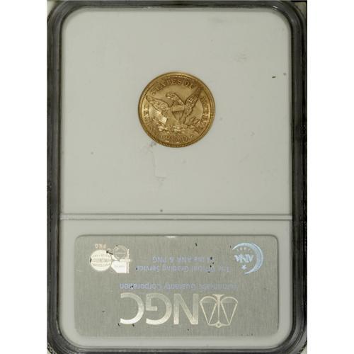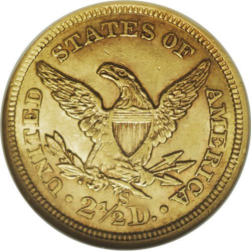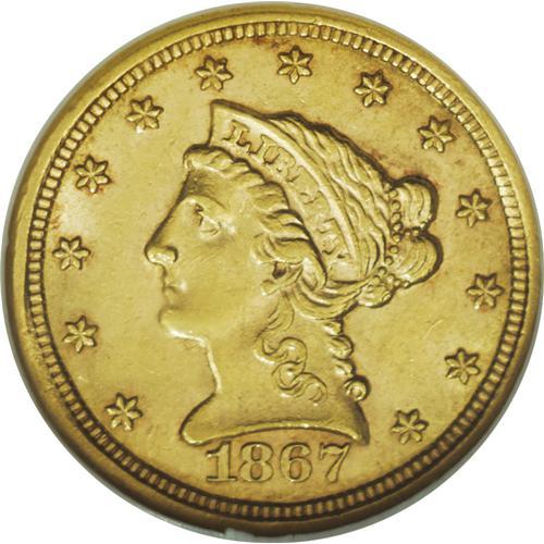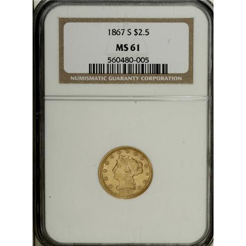 <B>1867-S $2 1/2 MS61 NGC.</B></I> Bright luster dominates the devices and legends. The striking details are sharp in all areas except on LIBERTY and the eagle's left leg, as seen on almost all S-mint quarter eagles from this era. A few wispy marks reside on the cheekbone and upper lip, but the surfaces are generally clean for an MS61 gold coin. Moderate clash marks outline the devices. Only 28,000 pieces were struck. Census: 8 in 61, 1 finer (3/07).<BR><BR><b>Shipping:</b> Coins & Currency (<a target="_blank" href="http://www.heritageauctions.com/common/shipping.php">view shipping information</a>)