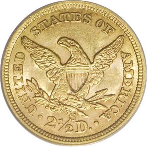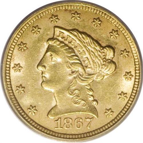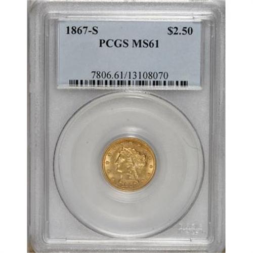 <B>1867-S $2 1/2 MS61 PCGS.</B></I> Bright luster dominates the devices and legends. The striking details are sharp in all areas except on LIBERTY and the eagle's left leg, as seen on almost all S-mint quarter eagles from this era. A few wispy marks are scattered over each side, but the surfaces are generally clean for an MS61 gold coin. Moderate clash marks outline the devices. Only 28,000 pieces were struck. Population: 3 in 61, 3 finer (4/07). <BR><BR><b>Shipping:</b> Coins & Currency (<a target="_blank" href="http://www.heritageauctions.com/common/shipping.php">view shipping information</a>)