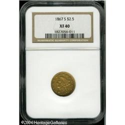 1867-S $2 1/2 XF40 NGC. Tan-gold patina with a few <B>1867-S $2 1/2 XF40 NGC.</B></I> Tan-gold patina with a few traces of red. Nicely detailed, save for softness on Liberty's hair. A few minute marks on the obverse are not bothersome. <BR><BR><B>Important notice:</B> Heritage usually auctions material at the rate of 200-250 lots per hour. On some occasions eBay Live bid software or the Internet may not be able to keep up with the pace of the auction. We recommend placing a realistic absentee bid now as insurance to avoid disappointment. Occasionally the auctioneer may eliminate or reject an eBay Live bid, and the auctioneer may also reopen a lot after the close of the eBay live bidding (usually because we missed an audience bid), and may reject your bid even if it shows you as the winning bidder. By bidding via eBay Live, you agree that Heritage may award the lot to another bidder at its sole discretion under the circumstances described above or any other reasonable circumstances. Since eBay bids are not shown to us until we open the lot on the floor, we treat those bids just like floor bids. In most cases the floor responds before the eBay bid is presented to us, due to Internet lag time, so for consistency we have made it a policy that floor bids are always considered first over tie eBay live bids. Also please note that all Heritage lots purchased through eBay Live carry a 20% Buyer's Premium. Please make sure you read the Terms and Conditions before you bid. This lot is being auctioned in conjunction with a live floor auction by Heritage Galleries & Auctioneers. All final auction and invoice information will be supplied by Heritage Galleries & Auctioneers, and all other information should be considered preliminary. Lot:6511