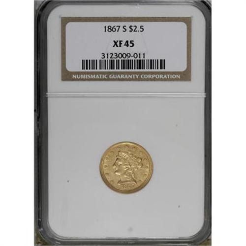 <B>1867-S $2 1/2 XF45 NGC.</B></I> NGC Census: (24/80). PCGS Population (21/35). Mintage: 28,000. Numismedia Wsl. Price for NGC/PCGS coin in XF45: $752. (#7806)<BR><BR><B>Coin Engraver:</B> Christian Gobrecht<BR><BR><b>Shipping:</b> Coins & Currency (<a target="_blank" href="http://www.heritageauctions.com/common/shipping.php">view shipping information</a>)