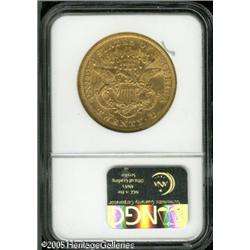 <B>1867-S $20 AU50 NGC.</B></I> Very scarce in all grades, this piece is extensively abraded, and displays an outline of reddish-pink color surrounding the devices. Lot:9030