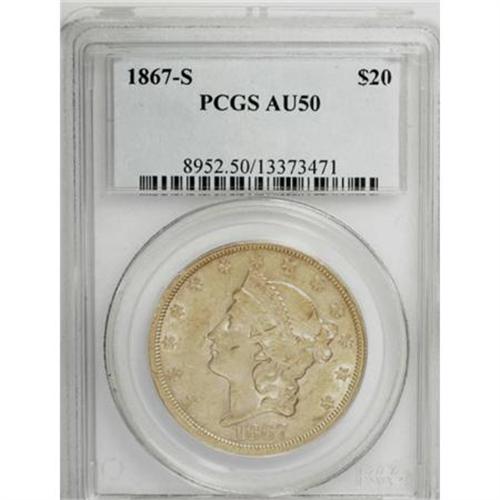 <B>1867-S $20 AU50 PCGS.</B></I> A softly struck wheat-gold and straw-gold exemplar that shows light wear across the devices. The fields remain luminous, though both sides show a number of moderate abrasions. Still, an interesting example of this San Francisco issue.<BR><BR><B>Coin Engraver:</B> James B. Longacre<BR><BR><b>Shipping:</b> Coins & Currency (<a target="_blank" href="http://www.heritageauctions.com/common/shipping.php">view shipping information</a>)
