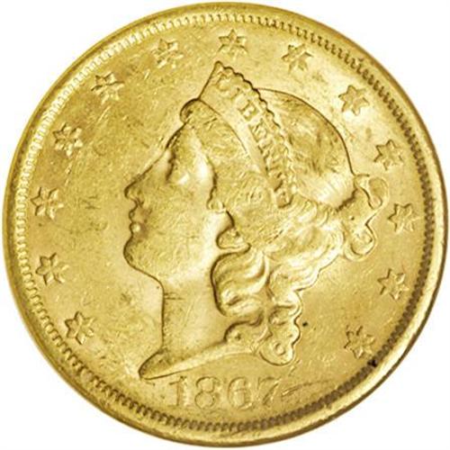 <B>1867-S<$20>--Cleaned--ANACS. AU58 Details.</B></I> The piece is moderately abraded throughout and, according to ANACS, has been harshly cleaned at some point in the past. Still somewhat lustrous, with pleasing pink and green-gold coloration.