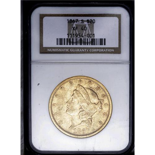 <B>1867-S<$20> XF40 NGC.</B></I> The '67-S is a scarcer Type Two double eagle and is seldom encountered above XF. The remaining design details on this piece are nearly complete and each side shows pink-orange and green coloration. Small abrasions and modest wear are seen on both obverse and reverse.<BR><I>From The Steve Glenn Collection.</B></I> <BR><BR><B>Important notice:</B> Heritage usually auctions material at the rate of 200-250 lots per hour. On some occasions eBay Live bid software or the Internet may not be able to keep up with the pace of the auction. We recommend placing a realistic absentee bid now as insurance to avoid disappointment. Occasionally the auctioneer may eliminate or reject an eBay Live bid, and the auctioneer may also reopen a lot after the close of the eBay live bidding (usually because we missed an audience bid), and may reject your bid even if it shows you as the winning bidder. By bidding via eBay Live, you agree that Heritage may award the lot to another bidder at its sole discretion under the circumstances described above or any other reasonable circumstances. Since eBay bids are not shown to us until we open the lot on the floor, we treat those bids just like floor bids. In most cases the floor responds before the eBay bid is presented to us, due to Internet lag time, so for consistency we have made it a policy that floor bids are always considered first over tie eBay live bids. Also please note that all Heritage lots purchased through eBay Live carry a 20% Buyer's Premium. Please make sure you read the Terms and Conditions before you bid. This lot is being auctioned in conjunction with a live floor auction by Heritage Galleries & Auctioneers. All final auction and invoice information will be supplied by Heritage Galleries & Auctioneers, and all other information should be considered preliminary. Lot:4222 <BR><BR><B>Winning Notification and Billing:</B> After the FINAL session in this auction is complete, Heritage will send e-mail and snail mail invoices. This process normally takes several days. All final auction and invoice information will be supplied by Heritage Galleries & Auctioneers, and all other information should be considered preliminary. <BR><BR>This auction will be conducted on a live auction floor and over the Internet through eBay Live. If you choose to place an absentee bid, please take a moment to <font color='#0000ff'><u><a href='http://pages.ebay.com/liveauctions/help/before/laabsentee.html'>learn how eBay Live absentee bidding works</a></u></font><font color='#000000'>