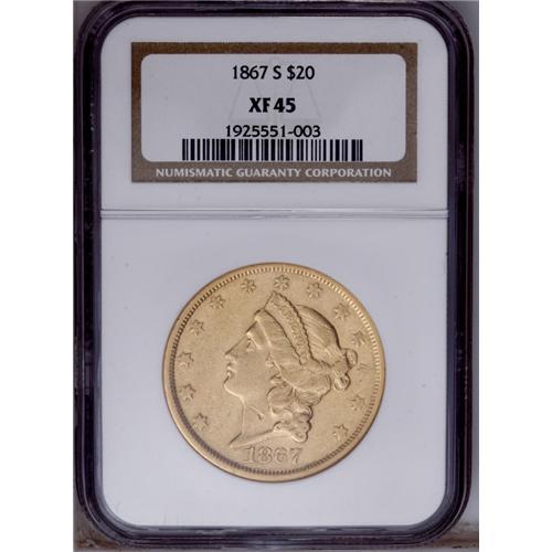 <B>1867-S<$20> XF45 NGC.</B></I> The 1867-S was struck after the Brother Jonathan and Republic shipwrecks, and as a result is nearly uncollectible in Mint State. Circulated pieces are available, however, and the present partly lustrous piece will satisfy the date and mint collector. Somewhat soft along the right borders, and Liberty's neck has a moderate mark.