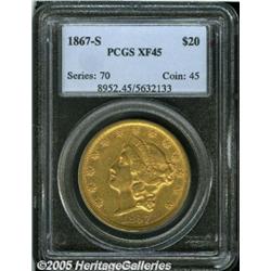<B>1867-S $20 XF45 PCGS.</B></I> Semi-bright apricot-gold surfaces display traces of luster clinging to the design elements. Portions of Liberty's hair are somewhat softly defined, otherwise the design features are nicely detailed.