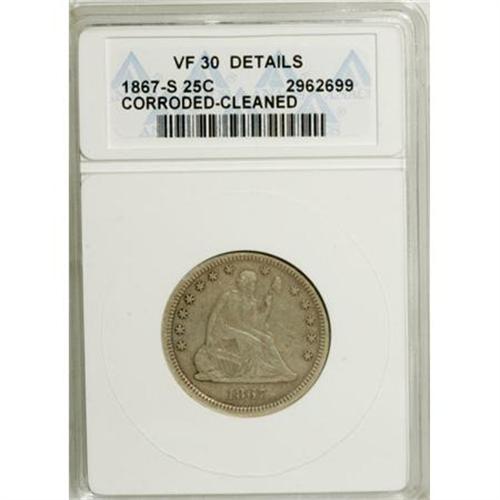 <B>1867-S 25C --Corroded, Cleaned--ANACS. VF30 Details.</B></I> A hairlined representative with minor ebony verdigris along portions of the reverse border. LIBERTY is bold. A faint, thin streak crosses the upper half of the obverse shield. Just 48,000 pieces were issued.<BR><BR><b>Shipping:</b> Coins & Currency (<a target="_blank" href="http://www.heritageauctions.com/common/shipping.php">view shipping information</a>)