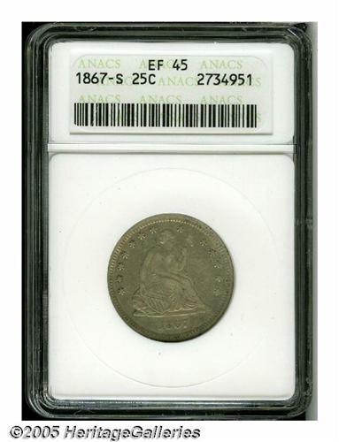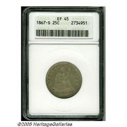 <B>1867-S<25C> XF45 ANACS.</B></I> Always a popular and in-demand issue with only 48,000 pieces produced. According to our auction records, this is the first Choice XF specimen to make an appearance through the major houses in the last 40 years, during which time only eleven pieces in higher grades have been offered. This example has light champagne-gray surfaces that display just a few faint marks in the right (facing) obverse field. The design elements are well defined, though some of the star centers are weak.<BR><I>From The Empire State Collection, Part Two.</B></I>