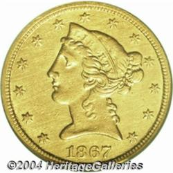 <B>1867-S<$5> AU Details, Improperly Cleaned, NCS.</B></I> One of several high grade representatives offered, this modestly subdued example is well detailed for a '67-S and displays a typical amount of contact in the fields. <BR><BR><B>Important notice:</B> Heritage usually auctions material at the rate of 200-250 lots per hour. On some occasions eBay Live bid software or the Internet may not be able to keep up with the pace of the auction. We recommend placing a realistic absentee bid now as insurance to avoid disappointment. Occasionally the auctioneer may eliminate or reject an eBay Live bid, and the auctioneer may also reopen a lot after the close of the eBay live bidding (usually because we missed an audience bid), and may reject your bid even if it shows you as the winning bidder. By bidding via eBay Live, you agree that Heritage may award the lot to another bidder at its sole discretion under the circumstances described above or any other reasonable circumstances. Since eBay bids are not shown to us until we open the lot on the floor, we treat those bids just like floor bids. In most cases the floor responds before the eBay bid is presented to us, due to Internet lag time, so for consistency we have made it a policy that floor bids are always considered first over tie eBay live bids. Also please note that all Heritage lots purchased through eBay Live carry a 20% Buyer's Premium. Please make sure you read the Terms and Conditions before you bid. </span></font></tr></table></td></tr></table>
